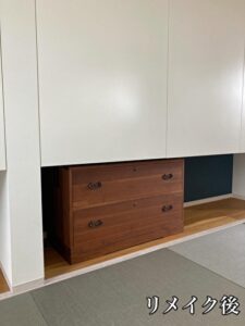 三重ねのタンスの上段をTVボード、中段と下段はリビングでも使えるようオイル仕上げにしました。