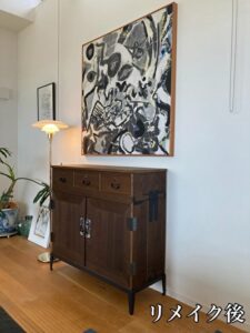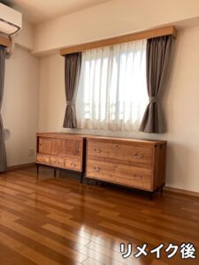 タンス上段は天板と木製の4本脚を新しく作り、テレビ台にリメイクしました。