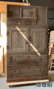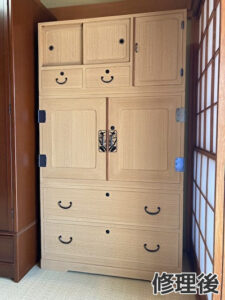オイル仕上げ 左側のタンスは上段と下段、右側のタンスは中段と下段を修理いたしました。